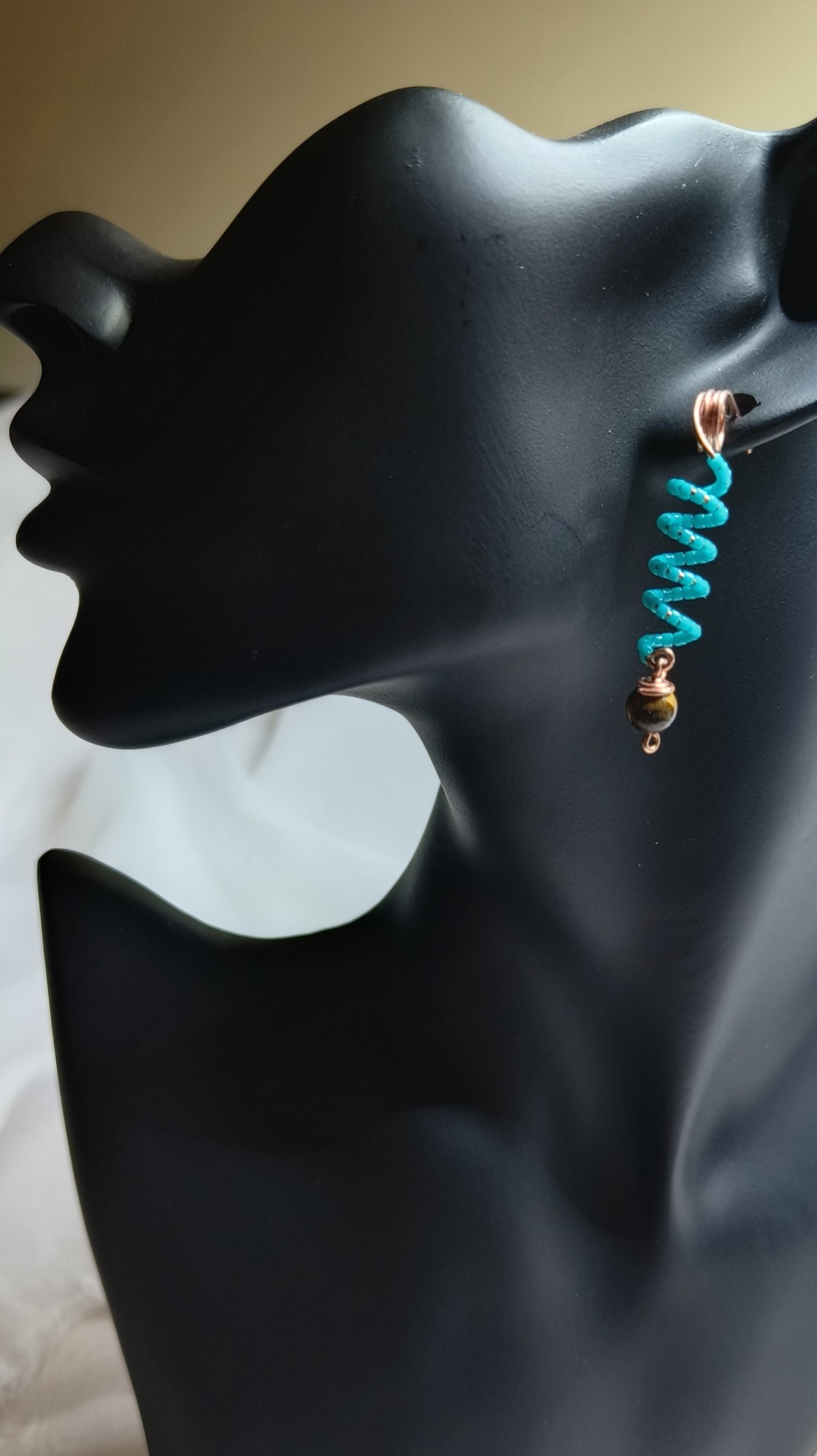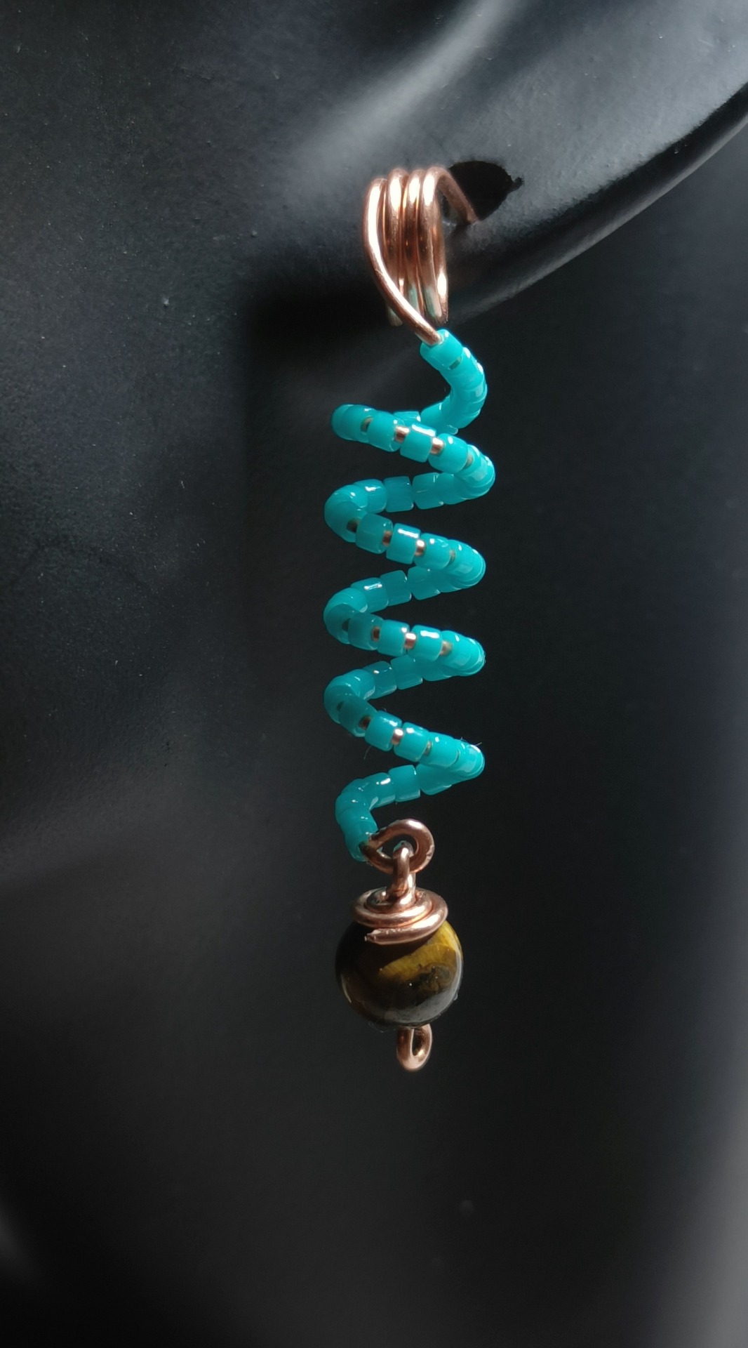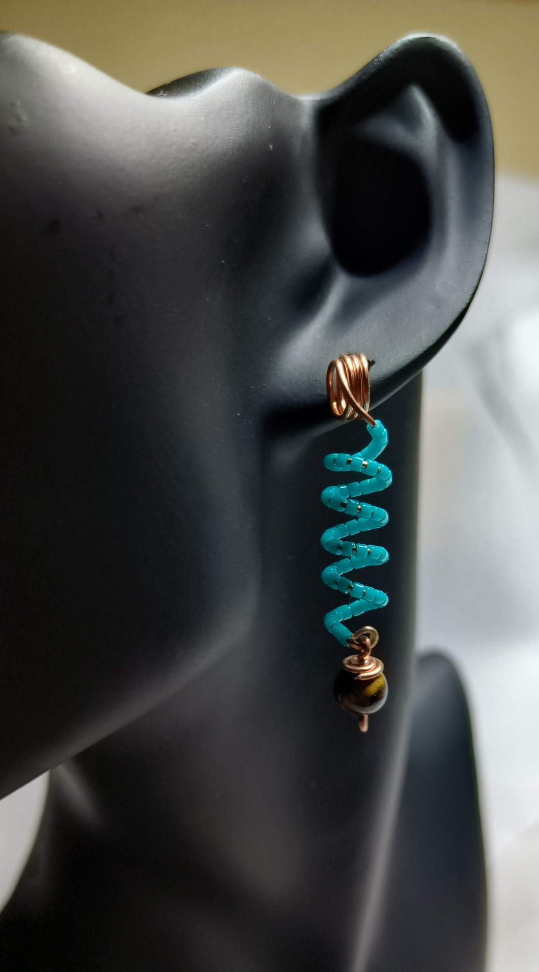 Cercei din sarma de cupru, margele de sticla japoneza si cristal Ochi de tigru.