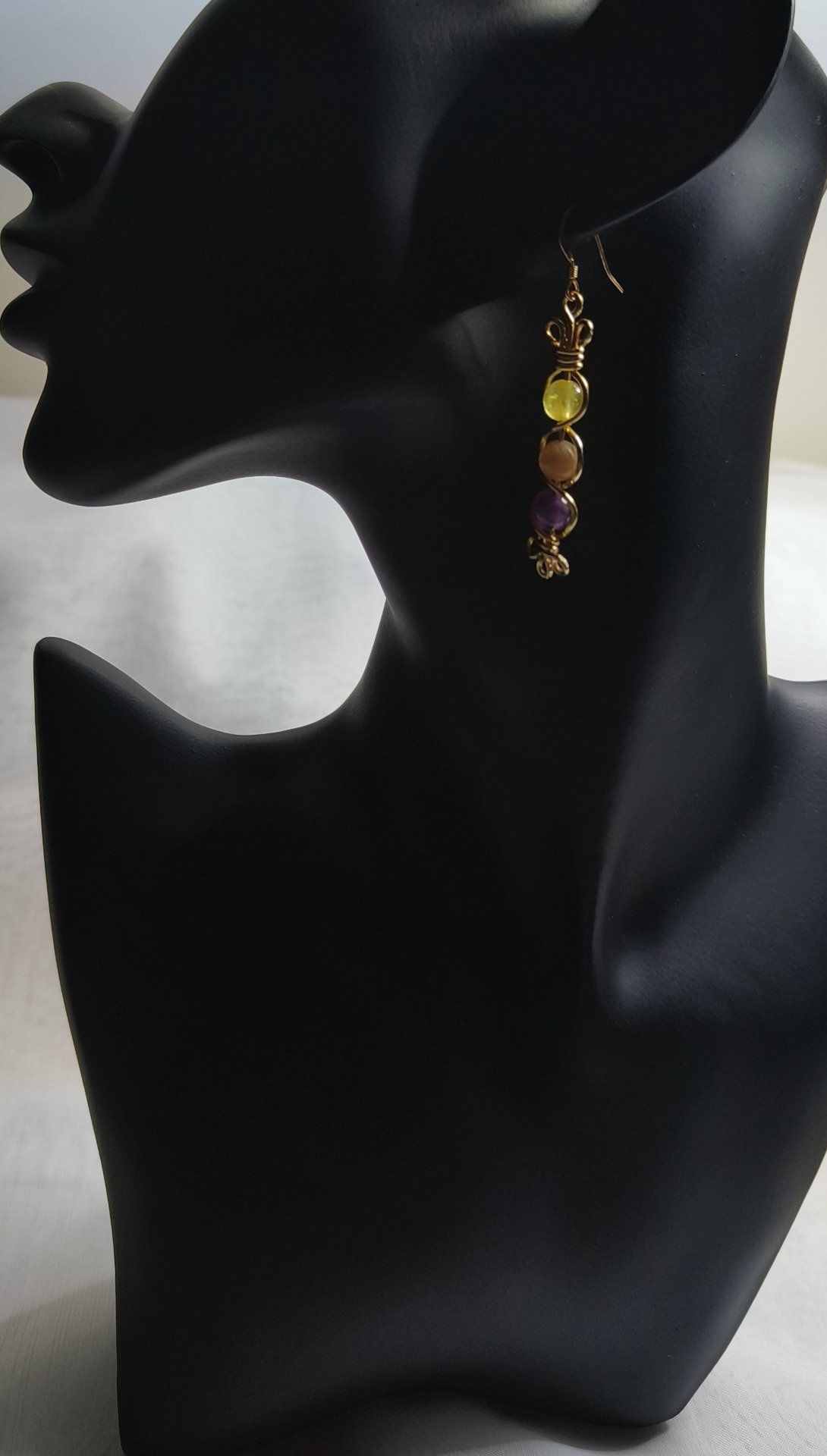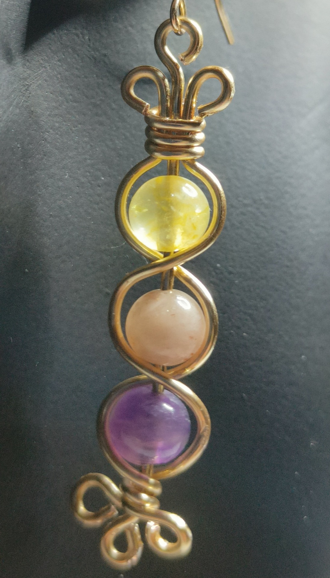 Cercei din sarma de cupru sau cupru aurit si cristale naturale cu tortite inoxidabile.