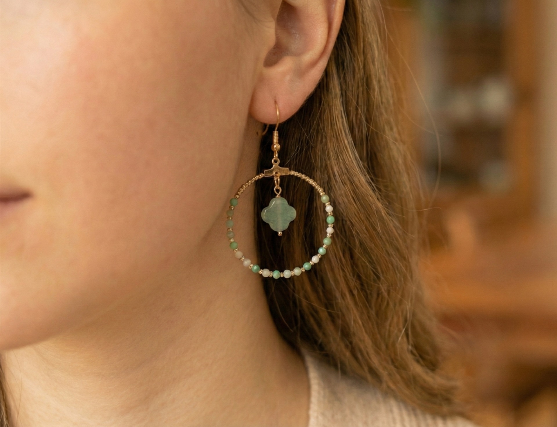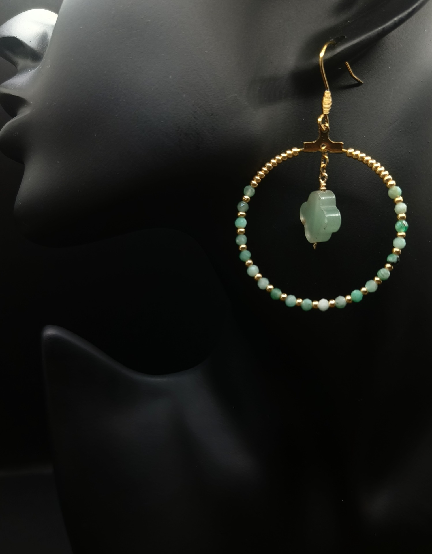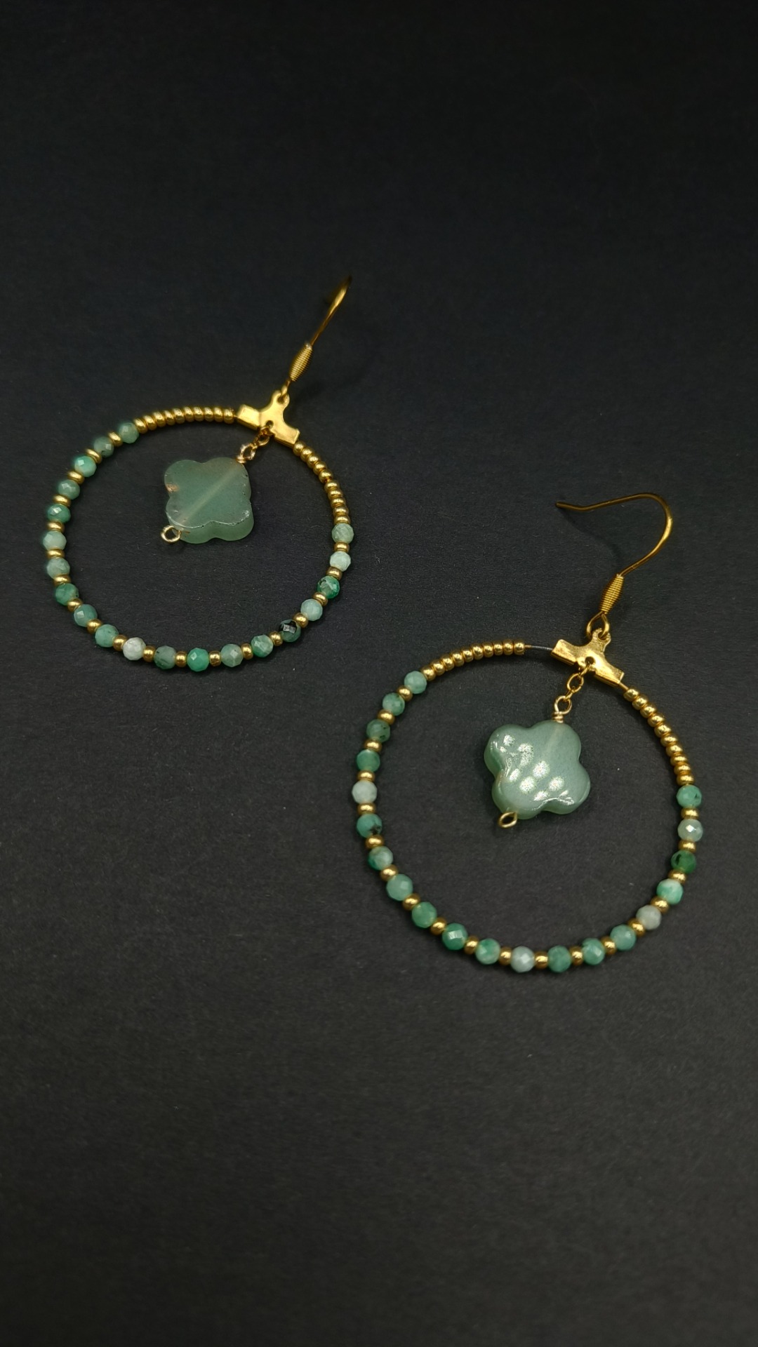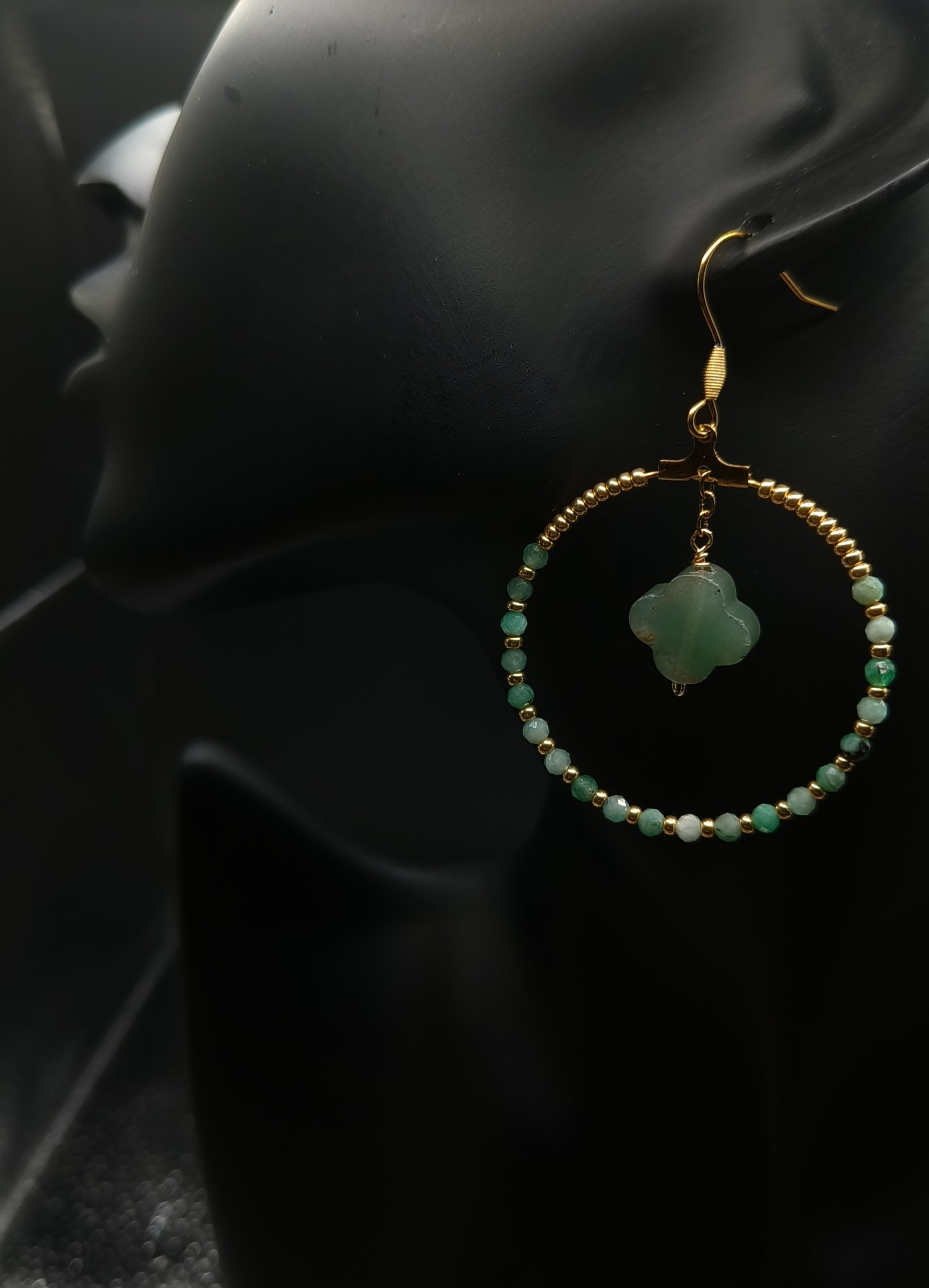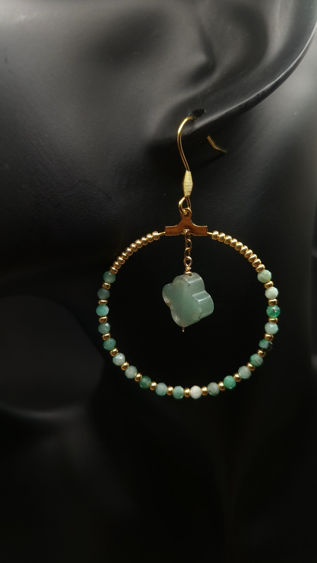 Cercei cu cristal de Aventurin in forma An”Anasha, simbolul recunostintei si cristale mici de Smarald.