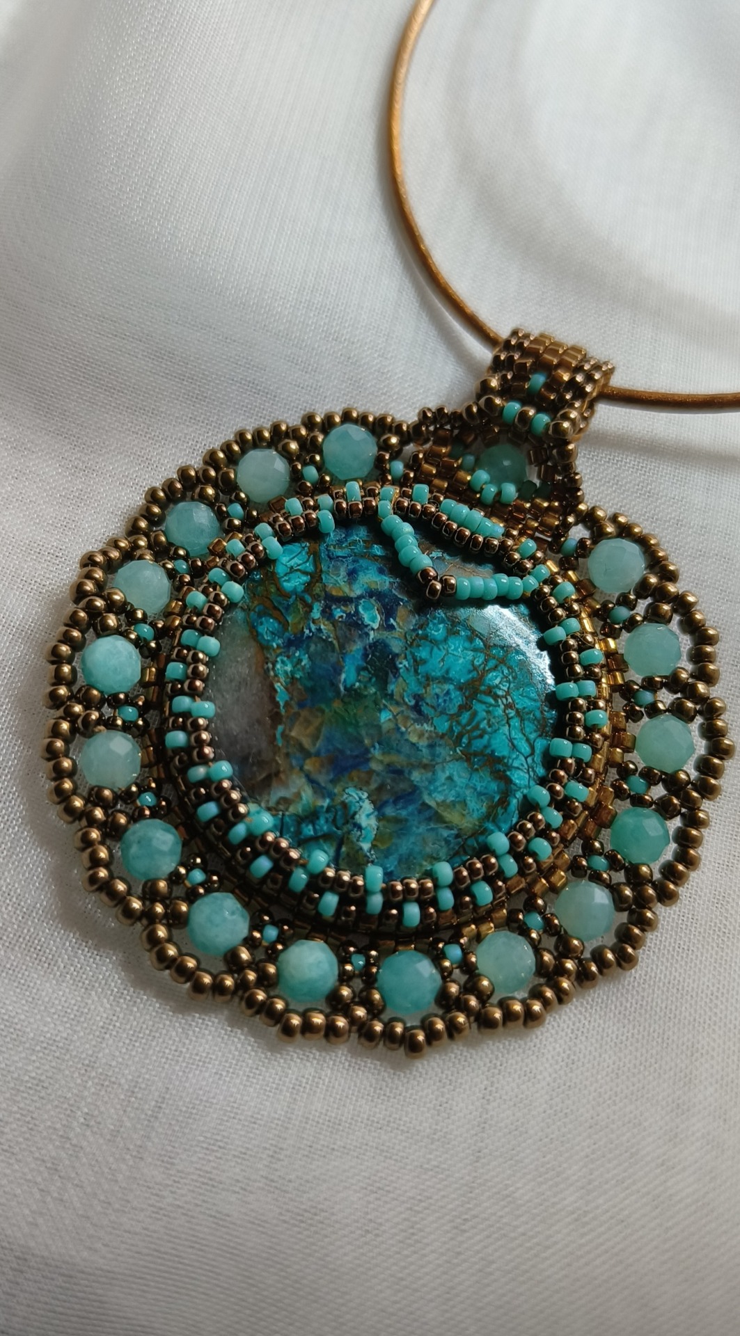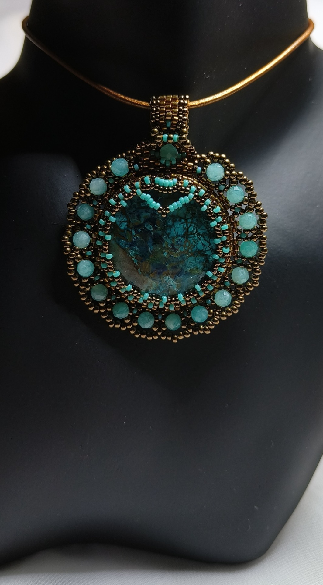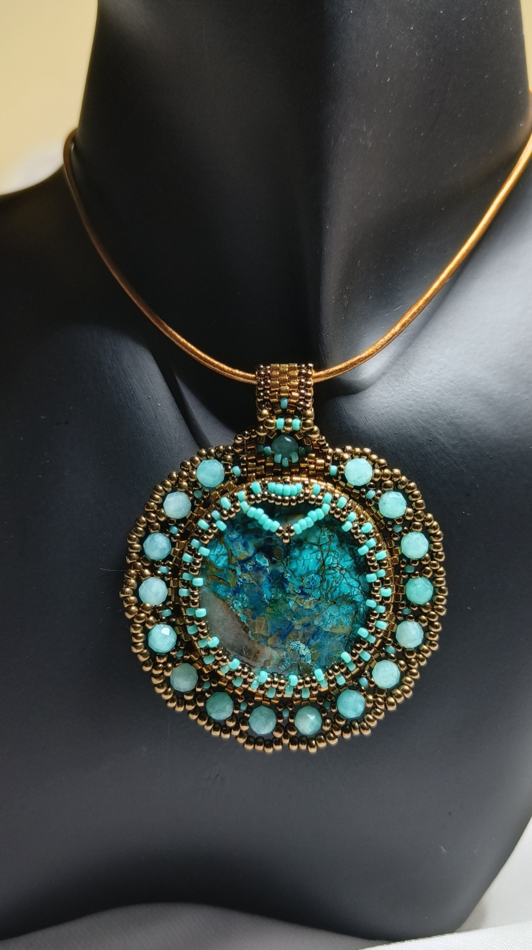 Pandant cu cristal de Crisocola si cristale mici de Amazonit, cu margele de sticla japoneza pe snur de piele.